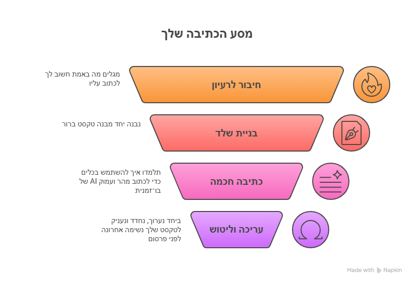 נבנה כאן מתווה ברור שמאפשר לך להפוך רעיון למילים, ומילים לטקסט שיש בו מהות.